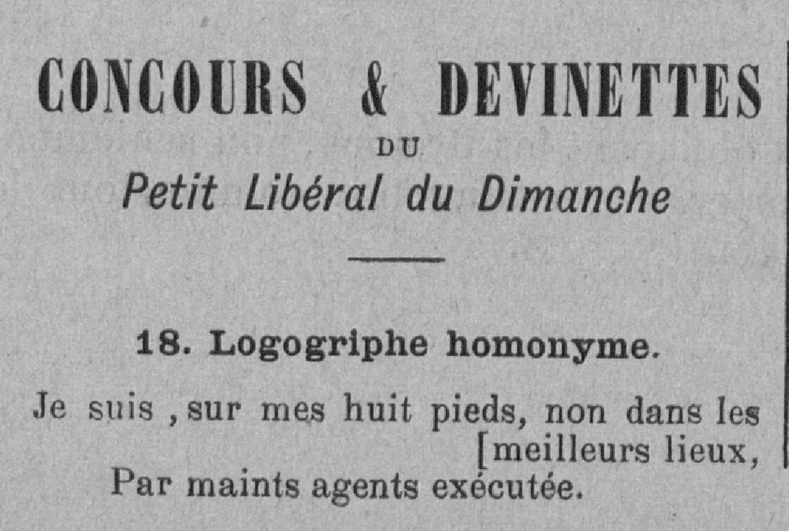 Le logogriphe est un véritable divertissement intellectuel. On en trouve par exemple dans les recueils d’énigmes de Mr l’Abbé Berthelin (1746) ou encore dans Le livre des jeux d’esprit de Félix Mouttet (1852), qui témoignent de leur popularité durable. La presse en publie également, qu’il s’agisse de titres nationaux ou de journaux locaux, et cette présence se prolonge bien au-delà du XIXᵉ siècle. Les rubriques récréatives continuent en effet de proposer charades, logogriphes et autres jeux d’esprit jusqu’au XXᵉ siècle, preuve de l’attachement durable du public à ces petites énigmes littéraires.