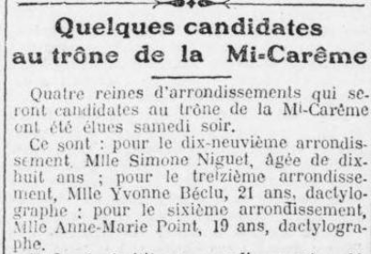 Au milieu de ces traditions parisiennes hautes en couleur, une jeune dactylographe de 21 ans s’apprête justement à entrer dans l’histoire du carnaval parisien : retournons maintenant à Yvonne Béclu, devenue à son tour reine parmi les reines. Le 7 février, nous apprenons qu’Yvonne est en compétition avec 3 autres candidates au trône de reine de la Mi-Carême : .