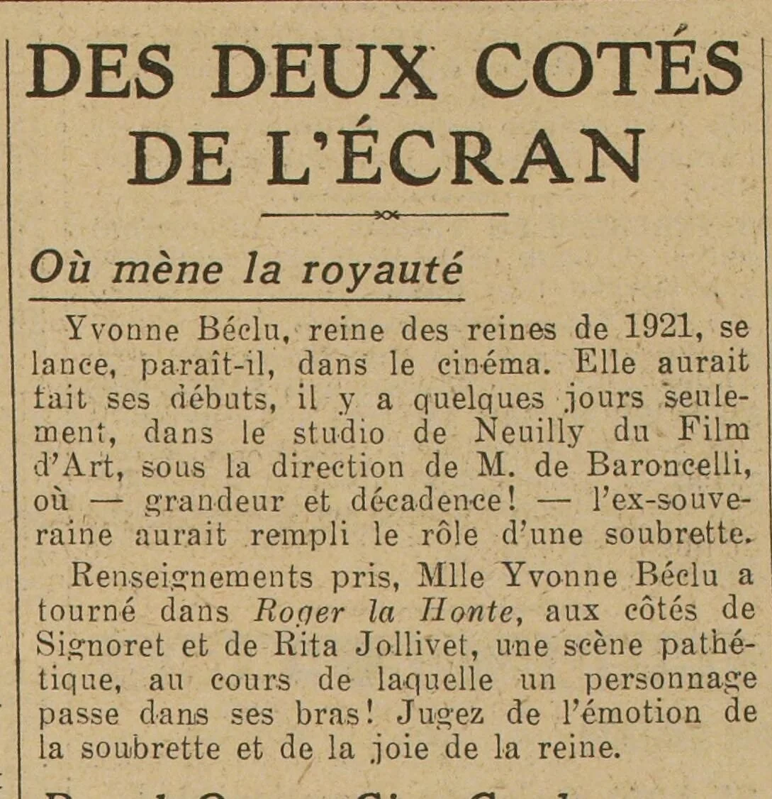 Source : Yvonne Beclu, reine des Reines, Agence Rol., 1921, Paris.