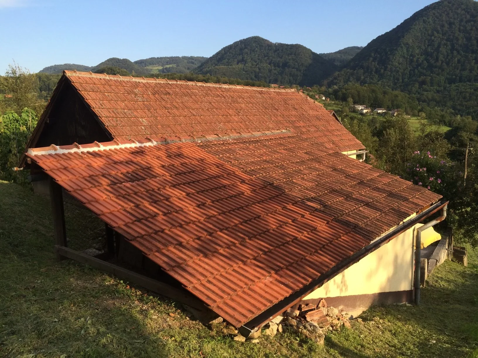 Dehors, une petite terrasse donne sur les arbres fruitiers, pruniers et pommiers, et surtout sur l’immensité verdoyante des montagnes. À droite de la maison se trouvait autrefois une chèvrerie, lieu de supplice pour mon père à qui Marija faisait boire le lait encore tiède ; à l’arrière et au-dessus de la maison un petit hangar où l’on stocke le foin et plus tard, un poulailler et un clapier. Un univers simple, presque immobile, où chaque objet semble avoir sa place depuis des décennies.